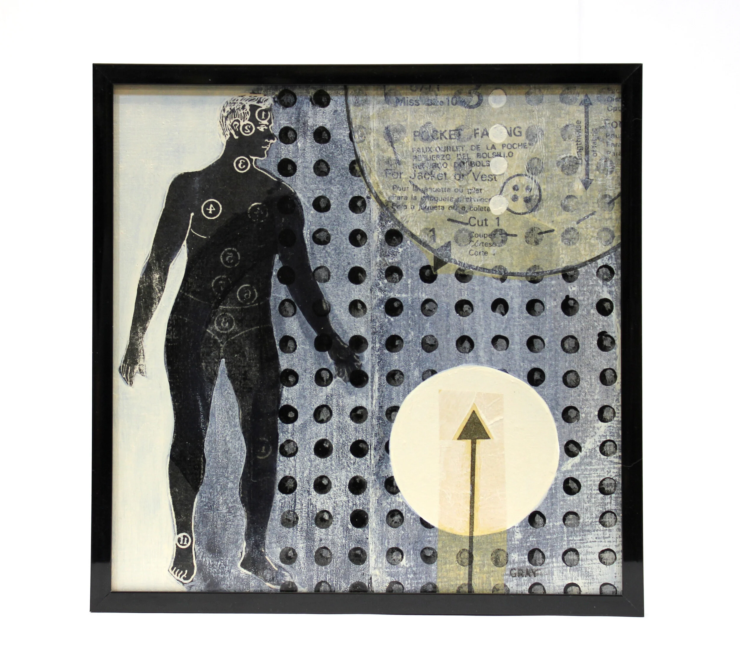 This is an original painting/collage/mixed media made up of transfers, collage and acrylic painting on panel. This piece is framed with a simple plastic frame.